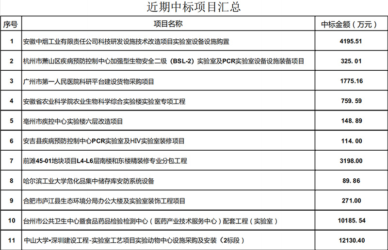 經過全體員工的不懈努力,公司近兩個月取得矚目的戰績,總中標金額近3.3億元,可喜可賀!中標項目如下所示: